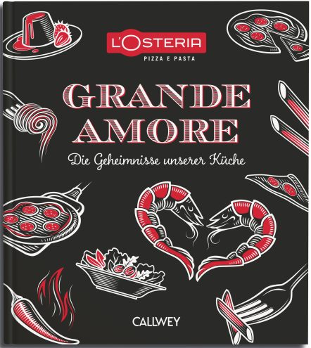L’OSTERIA GRANDE AMORE – DIE GEHEIMNISSE UNSERER KÜCHE erscheint im Callwey Format 25 x 28 cm mit einem edlen Hard-Cover, das in den Farben schwarz, weiß und rot stilvoll die Corporate Identity Elementen von L’Osteria integriert. Die partielle Hochprägung und auffälligen Lackdetails auf dem Cover sowie das rotes Leseband betonen die Hochwertigkeit und laden zum Schmökern ein. Auf jeder der 208 Seiten mit über 150 Bildern wird durch weitere unverwechselbare L’Osteria Elemente und einer goldenen Sonderfarbe italienische Lebensfreude transportiert. Alle Rezepte wurden exklusiv für das Buch zusammengestellt, gekocht und fotografiert.